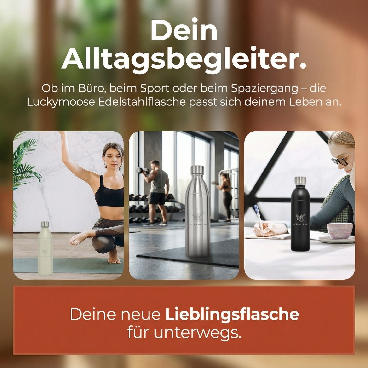 Die Edelstahlflaschen wiegen nur so viel wie ein kleines Buch (300g) und sind perfekt für den Einsatz beim Sport oder unterwegs - Ideal für einen aktiven Lebensstil.