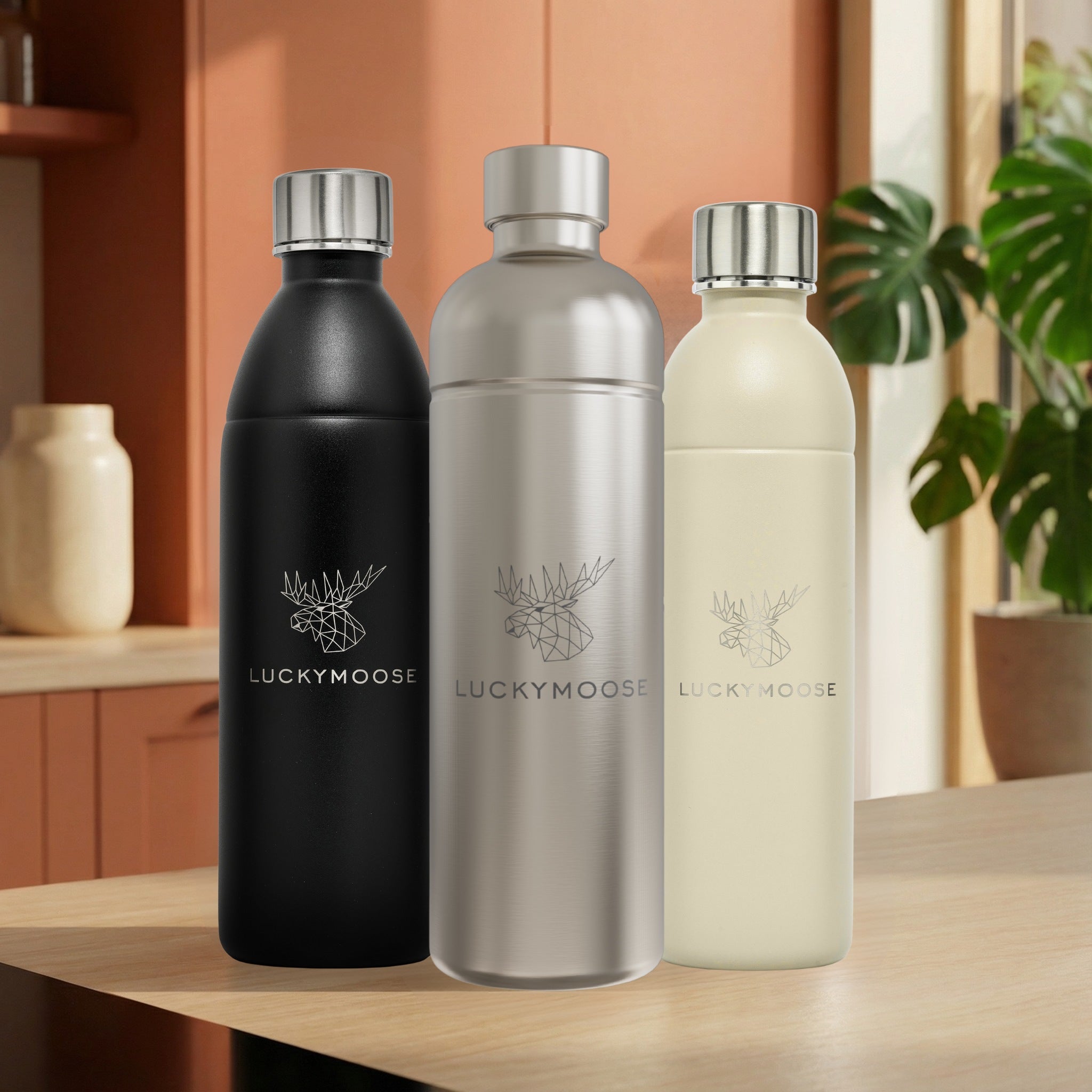 Die Luckymoose Edelstahlflasche vereint zeitloses Design mit purer Frische und wird zu deinem ständigen Begleiter. Ob zu Hause, im Büro oder unterwegs – genieße prickelndes Wasser in einer stilvollen Flasche, die Nachhaltigkeit und Eleganz perfekt verbindet.